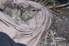 Graeme went out in the afternoon to help set the traps, then at midnight we went out to check them. Success! Our little group checked 14 traps and in total we found 4 northern bettongs, 3 northern brown bandicoots, 1 southern brown bandicoot, 1 brush-tailed possum, 1 giant white-tailed rant and 1 northern quoll – who had a pouch full of jellybean-sized joeys.